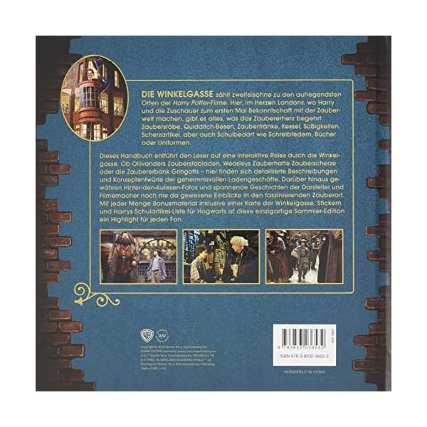 Dieses Handbuch entführt den Leser auf eine interaktive Reise durch die Winkelgasse. Ob Ollivanders Zauberstabladen, Weasleys Zauberhafte Zauberscherze oder die Zaubererbank Gringotts – hier finden sich detaillierte Beschreibungen und Konzeptentwürfe der geheimnisvollen Ladengeschäfte. Darüber hinaus gewähren Hinter-den-Kulissen-Fotos und spannende Geschichten der Darsteller und Filmemacher noch nie da gewesene Einblicke in den faszinierenden Zauberort. Mit jeder Menge Bonusmaterial inklusive einer Karte der Winkelgasse, Stickern und Harrys Schulartikel-Liste für Hogwarts ist diese einzigartige Sammler-Edition ein Highlight für jeden Fan